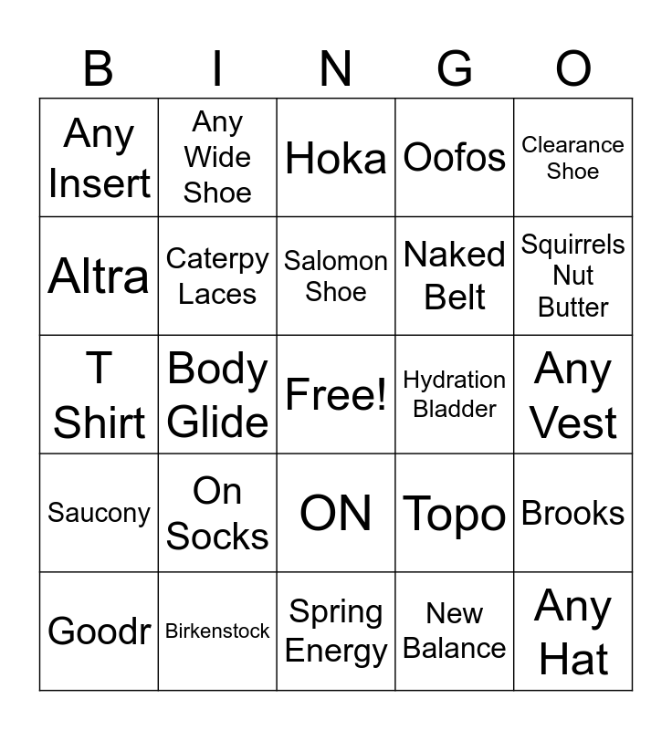 This bingo card has a free space and 24 words: On Socks, Birkenstock, Salomon Shoe, Goodr, Clearance Shoe, Any Insert, Altra, Any Wide Shoe, Hydration Bladder, ON, Naked Belt, T Shirt, Topo, Brooks, Caterpy Laces, New Balance, Any Vest, Hoka, Squirrels Nut Butter, Body Glide, Any Hat, Saucony, Oofos and Spring Energy.