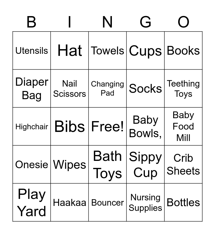 This bingo card has a free space and 37 words: Pacifier, Blankets, Diaper Pail, Nail Scissors, Crib Sheets, Wipes, Changing Pad, Burp Cloths, Books, Car Seat, Bibs, Cups, Bottles, Baby Food Mill, Diaper Bag, Onesie, Baby Carrier, Towels, Bath Toys, Baby Bowls,, Utensils, Teething Toys, Play Yard, Bouncer, Booties, Nursing Supplies, Hat, Car Seat Cover, Baby Toys, Cleaning Supplies, Nursing Pillow, Haakaa, Highchair, Swaddle, Sippy Cup, Socks and Baby Brush.
