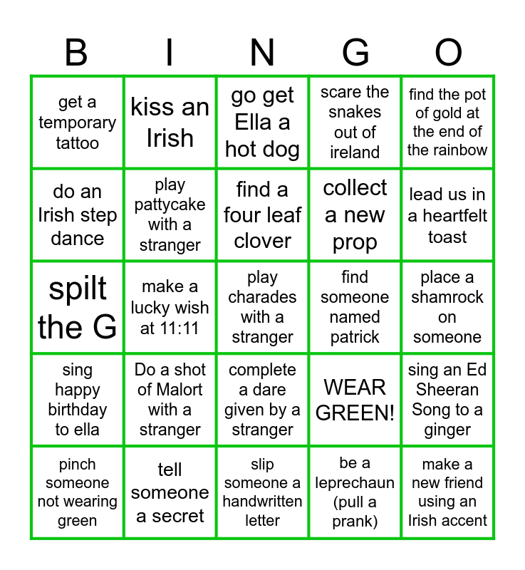 This bingo card has 25 words: Do a shot of Malort with a stranger, slip someone a handwritten letter, find a four leaf clover, pinch someone not wearing green, find the pot of gold at the end of the rainbow, get a temporary tattoo, do an Irish step dance, kiss an Irish, find someone named patrick, complete a dare given by a stranger, collect a new prop, spilt the G, WEAR GREEN!, sing an Ed Sheeran Song to a ginger, play pattycake with a stranger, make a new friend using an Irish accent, place a shamrock on someone, go get Ella a hot dog, lead us in a heartfelt toast, make a lucky wish at 11:11, play charades with a stranger, tell someone a secret, sing happy birthday to ella, scare the snakes out of ireland and be a leprechaun (pull a prank).