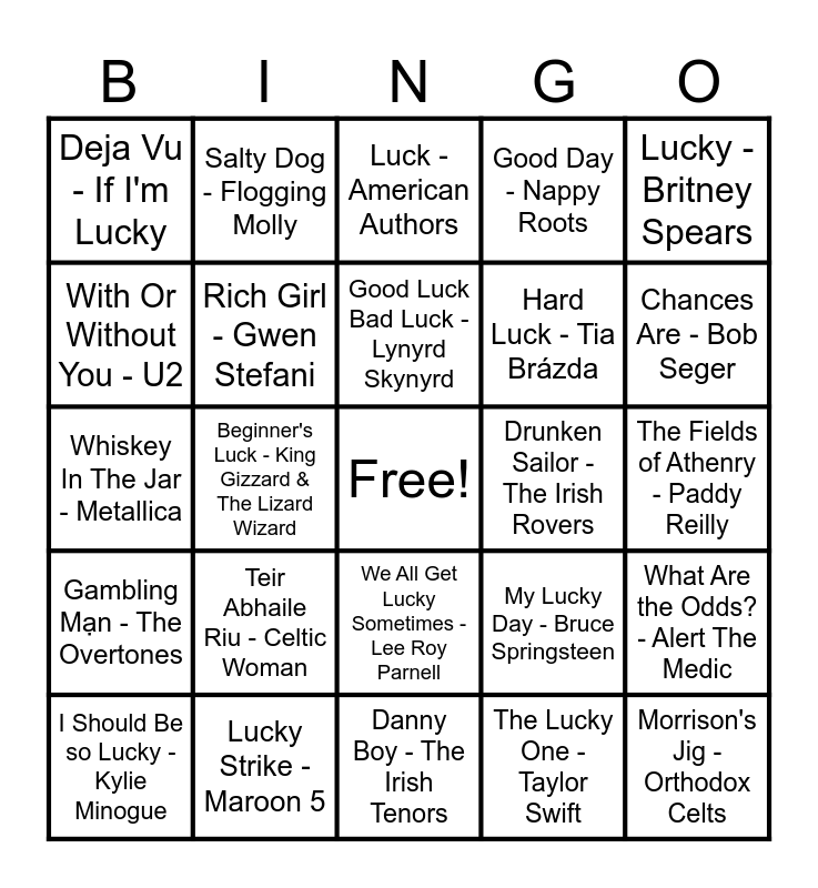 This bingo card has a free space and 97 words: Too Sweet - Hozier, Lucky Lips - Ruth Brown, Lucky You - Deftones, Beginner's Luck - King Gizzard & The Lizard Wizard, You Are My Lucky Star - Sammy Davis Jr., The Auld Triangle - Punch Brothers, Luckiest Man - The Wood Brothers., (They Call Me) Mr. Lucky - The OJays, Lucky - Elle King, Lucky - Jason Mraz, N17 - The Saw Doctors, Lucky Lucky Me - Marvin Gaye, The Galway Girl - Steve Earle, Gambling Mạn - The Overtones, Lucky (In My Life) - Eiffel 65, Deja Vu - If I'm Lucky, Lucky - Britney Spears, Lucky - Meghan Trainor, Lucky in Love - Mark Murphy, Lucky Day - Tom Waits, Lucky In Love - Mick Jagger, Luck Be A Lady - Frank Sinatra, Just Got Lucky - Jo Boxers, Lucky Day - Judy Garland, Changing of the Seasons - Two Door Cinema Club, Good Luck Bad Luck - Lynyrd Skynyrd, I Should Be so Lucky - Kylie Minogue, What Are the Odds? - Alert The Medic, Take A Chance On Me - ABBA, Lucky - Lucky Twice, Rich Girl - Gwen Stefani, Good Day - Nappy Roots, Ain't I The Lucky One - Marty Robbins, Be Lucky - The Who, Danny Boy - The Irish Tenors, We All Get Lucky Sometimes - Lee Roy Parnell, Mr. Blue Sky - Eléctric Light Orchestra, The Night Pat Murphy Died - Great Big Sea, Chances - Backstreet Boys, Whiskey In The Jar - Metallica, The Gambler - Kenny Rogers, The Fields of Athenry - Paddy Reilly, Another Irish Drinking Song - Da Vinci's Notebook, The Lucky One - Taylor Swift, Teir Abhaile Riu - Celtic Woman, Good Luck Babe! - Chappell Roan, If I Had $1 000 000 - Barenaked Ladies, If I'm Lucky - Jason Derulo, Nancy Mulligan - Ed Sheeran, 18 and Life - Skid Row, Lucky - Halsey, Lucky Lucky Me - Marvin Gaye, You Got Lucky - Tom Petty, Wired To The Moon - The Revs, Ironic - Alanis Morissette, Teenage Kicks - The Undertones, Lucky Star - Madonna, Salty Dog - Flogging Molly, Push My Luck - The Chainsmokers, Ready to Take a Chance Again - Barry Manilow, Good Luck Charm - Elvis Presley, Lucky Girl - Rival Sons, With A Little Luck - Wings, Fisherman's Blues - The Waterboys, Second Chance - 38 Special, Hard Luck Woman - KISS, Lucky Ones - Loverboy, Dreams - The Cranberries, Lucky Day - Louis II, Lucky Strike - Maroon 5, Hard Luck - Tia Brázda, The Rocky Road To Dublin - The High Kings, Lucky Girl - Carlina, Some Guys Have All the Luck - Rod Stewart, Breakeven - The Script, Lucky - Radiohead, Get Lucky - Daft Punk, This Is - Aslan, Drunken Sailor - The Irish Rovers, Taking Chances - Céline Dion, I'm on a Roll - Stefano, Chances Are - Bob Seger, Hollywood - Thin Lizzy, Raglan Road - Luke Kelly, Trying Your Luck - The Strokes, Seven Drunken Nights - The Dubliners, Morrison's Jig -Orthodox Celts, You're a Lucky Guy - Billie Holiday, Lucky Man - The Verve, Sometimes You Win - CHIC, Luck - American Authors, Lucky Me - The Knocks, I Feel Lucky - Mary Chapin Carpenter, My Lucky Day - Bruce Springsteen, With Or Without You - U2, Good Luck Charm - Jagged Edge and Sally MacLennane - The Pógues.