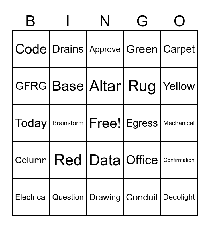 This bingo card has a free space and 99 words: Go ahead, Sorry, Review, Approve, Room, Baptistry, Font, Lighting, Contemporary, Transitional, Traditional, Fire, AV, Data, ADA, Code, Drains, Door, Window, Sealing, Partition, Sink, Portico, Laundry, Proportion, Confirmation, Altar, Section, Elevation, Plan, Drawing, Conduit, Modules, Break, Brainstorm, Today, Meeting, Business, Agenda, Red, Blue, Yellow, Green, Question, Answer, Cold, Hot, Agreed, Consider, Outlet, Decogrille, Decolight, Office, Desk, Wireless, Crawl, Drain, Toilet, Structural, Topic, Thanks, Toggle, Option, Enclosed, Tile, Carpet, Initiatory, Concrete, Slab, Column, Equipment, Rug, GFRG, GFRC, Spire, Crown, Base, Table, Casework, Cart, Egress, Attic, Locker, Pew, Canopy, Frieze, Pedestal, Plumbing, Mechanical, Electrical, Interior, Architecture, Meeting, Decide, Email, Thoughts, Absolutely, No and Yes.