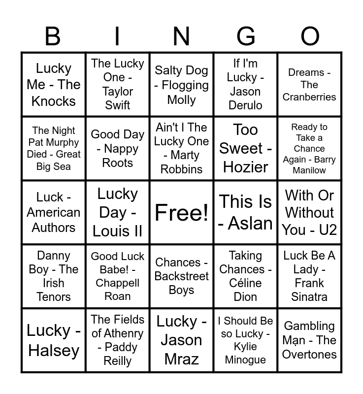 This bingo card has a free space and 97 words: Wired To The Moon - The Revs, I'm on a Roll - Stefano, You Are My Lucky Star - Sammy Davis Jr., Lucky Day - Louis II, Teir Abhaile Riu - Celtic Woman, The Auld Triangle - Punch Brothers, Seven Drunken Nights - The Dubliners, Get Lucky - Daft Punk, Take A Chance On Me - ABBA, Beginner's Luck - King Gizzard & The Lizard Wizard, Morrison's Jig -Orthodox Celts, Changing of the Seasons - Two Door Cinema Club, Sally MacLennane - The Pógues, Danny Boy - The Irish Tenors, Lucky Ones - Loverboy, Lucky Me - The Knocks, Dreams - The Cranberries, The Rocky Road To Dublin - The High Kings, Luckiest Man - The Wood Brothers., Be Lucky - The Who, What Are the Odds? - Alert The Medic, Good Luck Bad Luck - Lynyrd Skynyrd, (They Call Me) Mr. Lucky - The OJays, If I Had $1 000 000 - Barenaked Ladies, N17 - The Saw Doctors, Ain't I The Lucky One - Marty Robbins, Lucky - Halsey, Luck Be A Lady - Frank Sinatra, Lucky - Radiohead, My Lucky Day - Bruce Springsteen, Good Day - Nappy Roots, If I'm Lucky - Jason Derulo, Ironic - Alanis Morissette, Lucky Man - The Verve, Lucky - Jason Mraz, Chances - Backstreet Boys, Whiskey In The Jar - Metallica, Lucky Lucky Me - Marvin Gaye, Hard Luck Woman - KISS, Luck - American Authors, Good Luck Charm - Jagged Edge, With Or Without You - U2, The Galway Girl - Steve Earle, I Should Be so Lucky - Kylie Minogue, Good Luck Babe! - Chappell Roan, Rich Girl - Gwen Stefani, Lucky Girl - Carlina, Lucky Lucky Me - Marvin Gaye, With A Little Luck - Wings, The Gambler - Kenny Rogers, You're a Lucky Guy - Billie Holiday, Trying Your Luck - The Strokes, We All Get Lucky Sometimes - Lee Roy Parnell, Another Irish Drinking Song - Da Vinci's Notebook, You Got Lucky - Tom Petty, Lucky Lips - Ruth Brown, Lucky Day - Judy Garland, The Lucky One - Taylor Swift, Chances Are - Bob Seger, Mr. Blue Sky - Eléctric Light Orchestra, Breakeven - The Script, Lucky Star - Madonna, Nancy Mulligan - Ed Sheeran, Deja Vu - If I'm Lucky, Raglan Road - Luke Kelly, Lucky in Love - Mark Murphy, Hollywood - Thin Lizzy, Lucky You - Deftones, Lucky Strike - Maroon 5, The Fields of Athenry - Paddy Reilly, Too Sweet - Hozier, Good Luck Charm - Elvis Presley, Lucky - Lucky Twice, I Feel Lucky - Mary Chapin Carpenter, Lucky Girl - Rival Sons, Lucky - Elle King, Lucky (In My Life) - Eiffel 65, Some Guys Have All the Luck - Rod Stewart, This Is - Aslan, Drunken Sailor - The Irish Rovers, Sometimes You Win - CHIC, Ready to Take a Chance Again - Barry Manilow, Lucky In Love - Mick Jagger, Lucky Day - Tom Waits, Push My Luck - The Chainsmokers, Lucky - Britney Spears, Gambling Mạn - The Overtones, Second Chance - 38 Special, Just Got Lucky - Jo Boxers, Fisherman's Blues - The Waterboys, Salty Dog - Flogging Molly, 18 and Life - Skid Row, Teenage Kicks - The Undertones, Taking Chances - Céline Dion, The Night Pat Murphy Died - Great Big Sea, Lucky - Meghan Trainor and Hard Luck - Tia Brázda.
