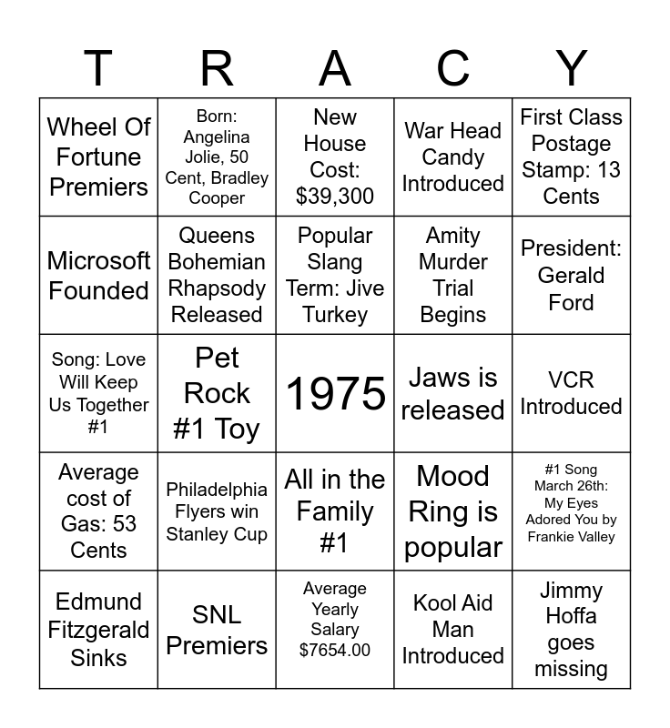 This bingo card has a free space and 24 words: Philadelphia Flyers win Stanley Cup, SNL Premiers, Popular Slang Term: Jive Turkey, Edmund Fitzgerald Sinks, First Class Postage Stamp: 13 Cents, Wheel Of Fortune Premiers, Microsoft Founded, Born: Angelina Jolie, 50 Cent, Bradley Cooper, Jaws is released, All in the Family #1, Amity Murder Trial Begins, Song: Love Will Keep Us Together #1, Mood Ring is popular, #1 Song March 26th: My Eyes Adored You by Frankie Valley, Queens Bohemian Rhapsody Released, Kool Aid Man Introduced, VCR Introduced, New House Cost: $39,300, President: Gerald Ford, Pet Rock #1 Toy, Jimmy Hoffa goes missing, Average cost of Gas: 53 Cents, War Head Candy Introduced and Average Yearly Salary $7654.00.
