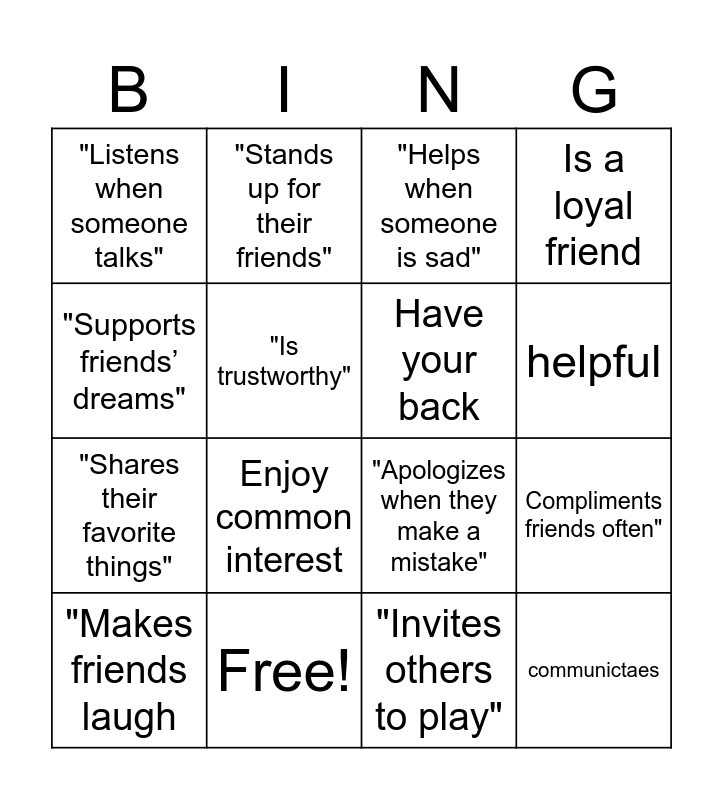 This bingo card has 16 words: Free!, Compliments friends often", "Helps when someone is sad", "Listens when someone talks", "Shares their favorite things", "Stands up for their friends", "Apologizes when they make a mistake", "Invites others to play", "Supports friends’ dreams", "Is trustworthy", "Makes friends laugh, Is a loyal friend, Enjoy common interest, helpful, Have your back and communictaes.