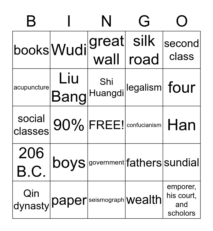 This bingo card has a free space and 24 words: boys, paper, Shi Huangdi, Qin dynasty, second class, books, acupuncture, Wudi, confucianism, government, legalism, social classes, fathers, sundial, Liu Bang, wealth, Han, great wall, four, 90%, emporer, his court, and scholors, 206 B.C., silk road and seismograph.
