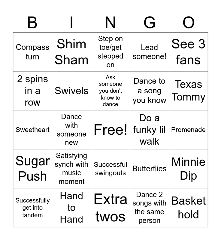 This bingo card has a free space and 24 words: Satisfying synch with music moment, Hand to Hand, Ask someone you don't know to dance, Successfully get into tandem, See 3 fans, Compass turn, 2 spins in a row, Shim Sham, Do a funky lil walk, Successful swingouts, Dance to a song you know, Sweetheart, Butterflies, Minnie Dip, Swivels, Dance 2 songs with the same person, Promenade, Step on toe/get stepped on, Texas Tommy, Dance with someone new, Basket hold, Sugar Push, Lead someone! and Extra twos.