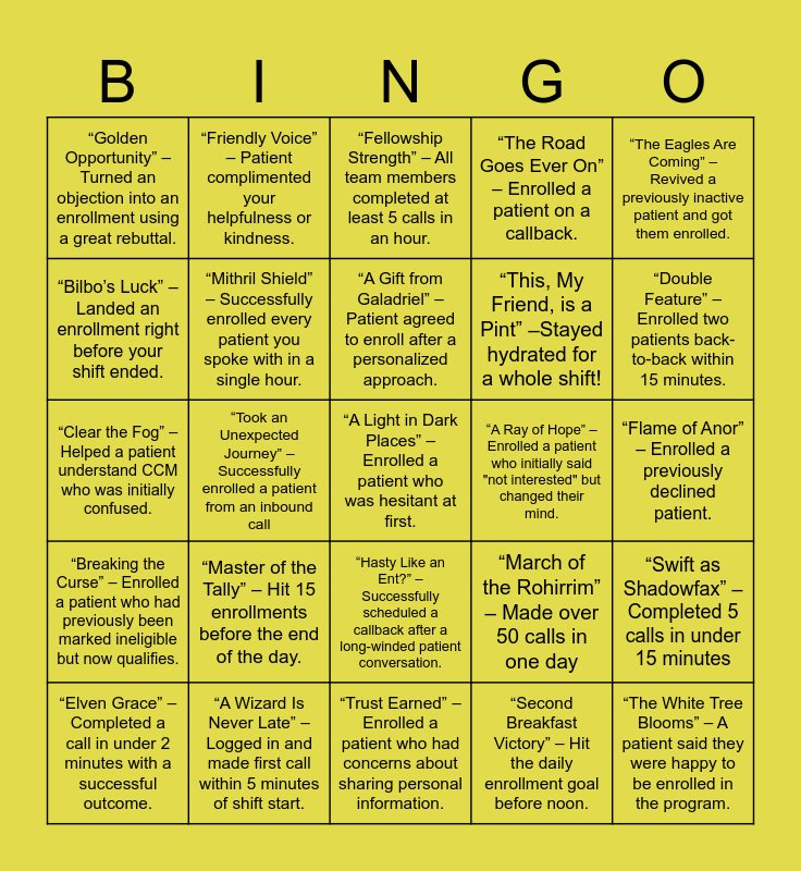 This bingo card has 45 words: “You Have My Sword” – Helped another ES., “A Light in Dark Places” – Enrolled a patient who was hesitant at first., “One Does Not Simply Give Up” – Successfully enrolled a patient after overcoming an objection., “Elven Grace” – Completed a call in under 2 minutes with a successful outcome., “The Council Has Decided” – Got a patient to sign up after a household/family member discussion., “Second Breakfast Victory” – Hit the daily enrollment goal before noon., “Fellowship Strength” – All team members completed at least 5 calls in an hour., “And My Bow” – Scheduled a callback for a patient who was unsure., “The Eagles Are Coming” – Revived a previously inactive patient and got them enrolled., “A Wizard Is Never Late” – Logged in and made first call within 5 minutes of shift start., “The Road Goes Ever On” – Enrolled a patient on a callback., “A Ray of Hope” – Enrolled a patient who initially said "not interested" but changed their mind., “Hasty Like an Ent?” – Successfully scheduled a callback after a long-winded patient conversation., “Master of the Tally” – Hit 15 enrollments before the end of the day., “Wind at Your Back” – Got an immediate “Yes!” from a patient with no objections., “Trust Earned” – Enrolled a patient who had concerns about sharing personal information., “One Call to Rule Them All” – Got an enrollment on the first call of the day., “Clear the Fog” – Helped a patient understand CCM who was initially confused., “Momentum Shift” – Had a rough start but enrolled 2+ patients in the last hour., “Double Feature” – Enrolled two patients back-to-back within 15 minutes., “Friendly Voice” – Patient complimented your helpfulness or kindness., “The Steward of Gondor” – Closed an enrollment ticket or referral after enrolling the patient., “First Breakfast” – Got an enrollment in the first hour of your shift., “Golden Opportunity” – Turned an objection into an enrollment using a great rebuttal., “Fortune Favors the Bold” – Got 2 enrollments from one call., “Flame of Anor” – Enrolled a previously declined patient., “The Shire’s Hospitality” – Had a pleasant, chatty patient who enrolled with no issues., “The Steward’s Wisdom” – Sent an informative letter to a patient, “March of the Rohirrim” – Made over 50 calls in one day, “Breaking the Curse” – Enrolled a patient who had previously been marked ineligible but now qualifies., “A Fellowship United” – Encouraged a struggling teammate, “Swift as Shadowfax” – Completed 5 calls in under 15 minutes, “Unseen but Ever Present” – Patient asked to enroll a family member/caregiver/etc. in the program, “Patience of the Ents” – Successfully enrolled a patient who needed a lot of hand-holding., “Path of the Ranger” – Successfully enrolled a difficult or skeptical patient., “Took an Unexpected Journey” – Successfully enrolled a patient from an inbound call, “Sun Rises Over Gondor” – Hit 12 enrollments before lunch., “Riddle Me This” – Answered a tricky patient question confidently, earning their trust., “The White Tree Blooms” – A patient said they were happy to be enrolled in the program., “A Gift from Galadriel” – Patient agreed to enroll after a personalized approach., “Bilbo’s Luck” – Landed an enrollment right before your shift ended., “This, My Friend, is a Pint” –Stayed hydrated for a whole shift!, “I Am No Man” – Each member of your fellowship enrolled at least 10 patients on the same day., “Mithril Shield” – Successfully enrolled every patient you spoke with in a single hour. and “The Ringbearer Prevails” – Hit 20 enrollments in one day..