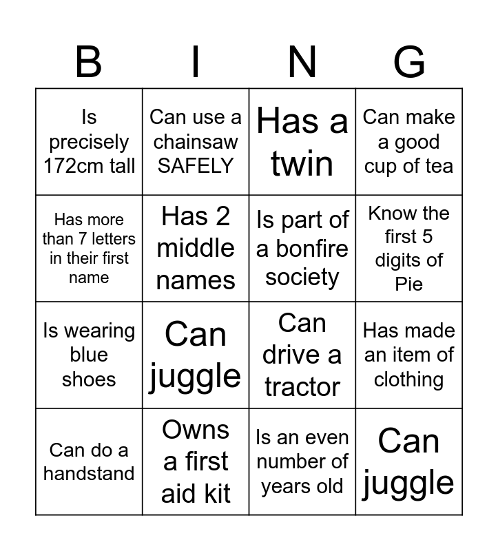 ⚠ This card has duplicate items: Speaks another language (2), Has a twin (2), Has been to the Check Republic (2), Has been to Tenerife (2), Can sail a boat (2), Can do a clove hitch (2), Has broken a bone (2), Play a sport competitively (2), Can sing/dance/act (2), Is precisely 172cm tall (2), Can play a musical instrument (2), Know the first 5 digits of Pie (2), Has 2 middle names (2), Can quote a line from Shakespeare (2), Has made an item of clothing (2), Has wone a competition (2), Can do a handstand (2), Can make a campfire (2), Has more than 7 letters in their first name (2), Always knows which way is north (2), Can drive a tractor (2), Is part of a bonfire society (2), Can use a chainsaw SAFELY (2), Can make a good cup of tea (2), Has 4 or more siblings (2), Can count to 10 in another language (2), Can outrun Will (2), Someone who has the same name as a member of your family (2), Owns a first aid kit (2), Is the only person from their unit at the selection weekend (2), Doesn't like strawberries (2), Owns a dog (2), Owns a cat (2), Can juggle (2), Is wearing blue shoes (2), Is wearing a red shirt (2), Has met someone famous (2), Is an even number of years old (2)