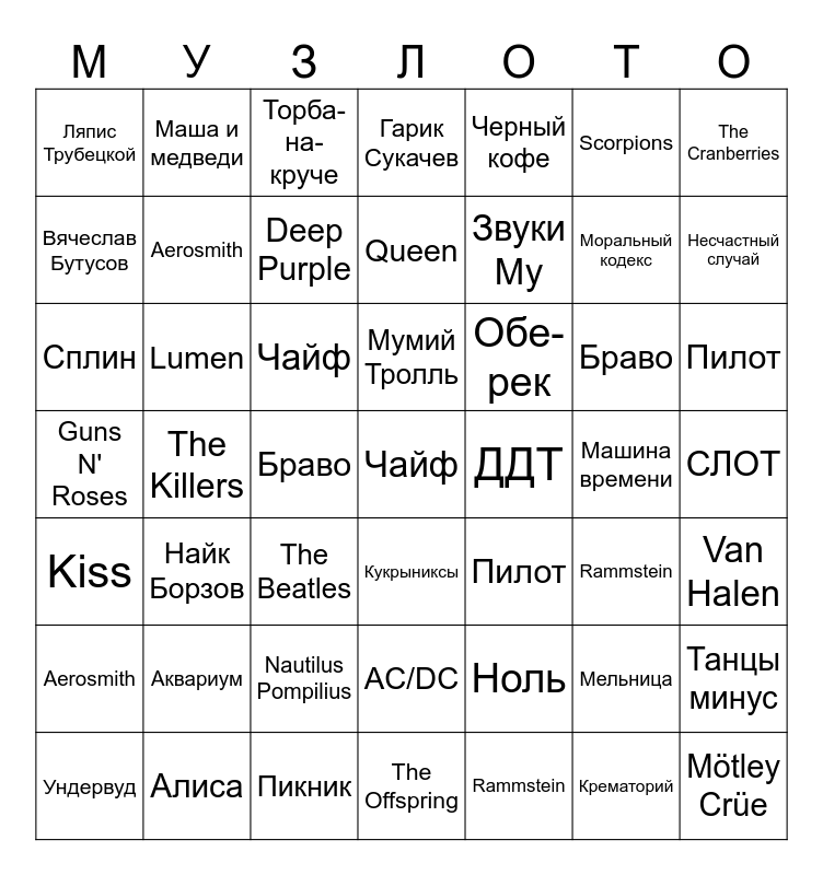 ⚠ This card has duplicate items: Pink Floyd (2), Порнофильмы (2), Metallica (2), Scorpions (2), Альянс (2), Гарик Сукачев (2), Deep Purple (2), Led Zeppelin (2), Red Hot Chili Peppers (2), Разные люди (2), Черный кофе (2), Aerosmith (2), Gorky Park (2), The Cranberries (2), Nirvana (2), ДДТ (2), Ляпис Трубецкой (2), U2 (2), Кино (2), Guns N' Roses (2), Чиж&Со (2), СЛОТ (2), Черный обелиск (2), Kiss (2), Калинов Мост (2), Queen (2), Green Day (2), Чайф (2), Маша и медведи (2), Смысловые галлюцинации (2), Воскресение (2), Танцы минус (2), ZZ Top (2), Несчастный случай (2), Ария (2), Megadeth (2), Van Halen (2), Ночные снайперы (2), Агата Кристи (2), Ноль (2), Мумий Тролль (2), Rammstein (2), Сектор Газа (2), Гражданская оборона (2), Машина времени (2), Depeche Mode (2), Ногу свело (2), The Rolling Stones (2), Земфира (2), Алиса (2), Ундервуд (2), Nautilus Pompilius (2), Найк Борзов (2), Мураками (2), Торба-на-круче (2), Чичерина (2), AC/DC (2), Звуки Му (2), АукцЫон (2), Mötley Crüe (2), Моральный кодекс (2), The Killers (2), Вячеслав Бутусов (2), Король и шут (2), Обе-рек (2), Тараканы! (2), Браво (2), Мельница (2), Пилот (2), Linkin Park (2), АнимациЯ (2), Ольга Кормухина (2), The Offspring (2), System of a Down (2), Би-2 (2), Крематорий (2), Black Sabbath (2), Аквариум (2), Motörhead (2), Дайте танк! (2), Секрет (2), Зоопарк (2), Сплин (2), Кукрыниксы (2), The Beatles (2), Lumen (2), The Doors (2), Монгол Шуудан (2), Ленинград (2), Пикник (2)