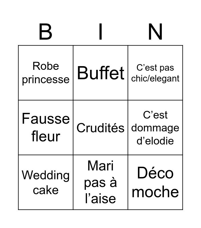 This bingo card has a free space and 8 words: C’est dommage d’elodie, C’est pas chic/elegant, Buffet, Wedding cake, Robe princesse, Déco moche, Fausse fleur and Mari pas à l’aise.