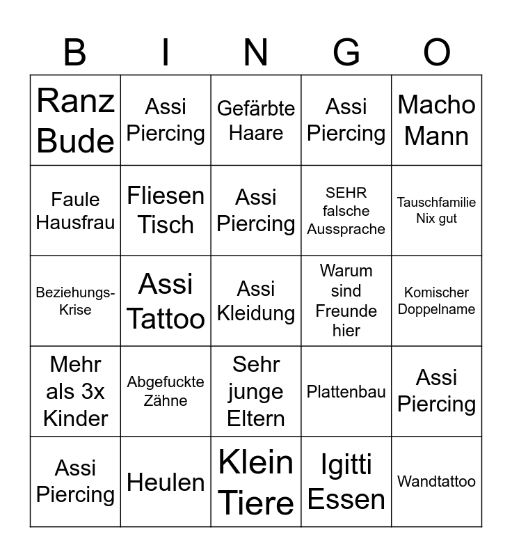 This bingo card has a free space and 29 words: Assi Piercing, Arbeitslos, Assi Tattoo, Rauchen, Ranz Bude, Gefärbte Haare, Fliesen Tisch, Abgefuckte Zähne, Warum sind Freunde hier, Heulen, Komischer Doppelname, Wandtattoo, Klein Tiere, Igitti Essen, Tauschfamilie Nix gut, Schimmel, Sehr junge Eltern, Mehr als 3x Kinder, Macho Mann, Beziehungs- Krise, Plattenbau, Hässliche Wände, SEHR falsche Aussprache, Faule Hausfrau, Assi Piercing, Assi Piercing, Assi Piercing, Assi Piercing and Assi Piercing.
