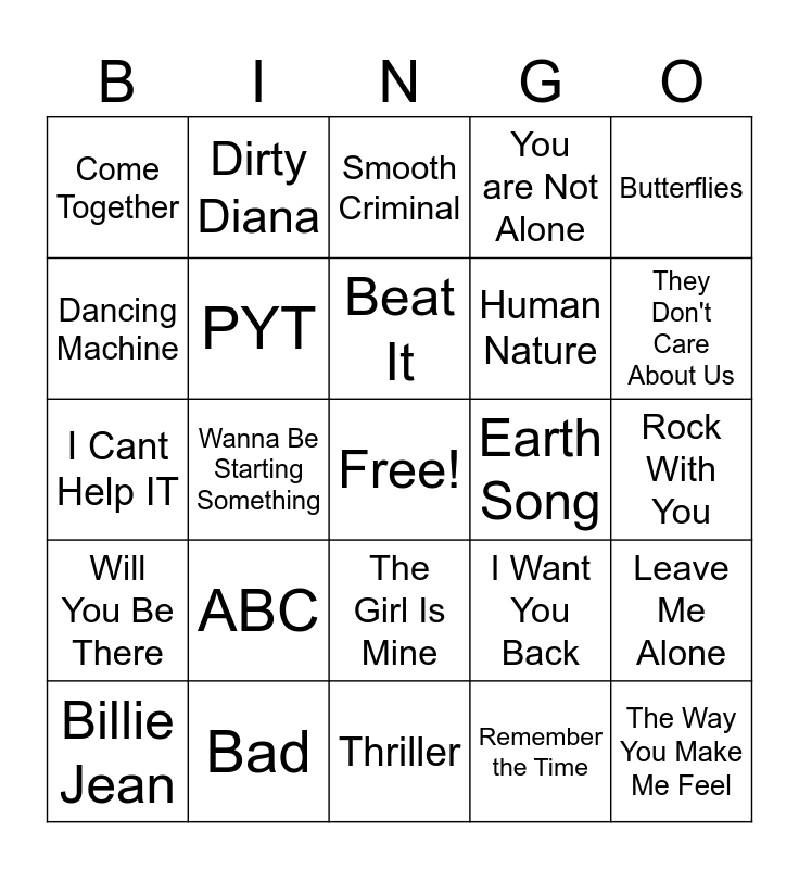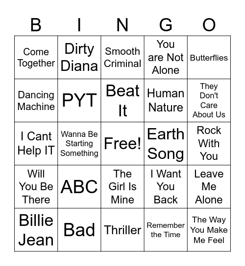 This bingo card has a free space and 24 words: ABC, Bad, Beat It, Billie Jean, Butterflies, Come Together, Dancing Machine, Dirty Diana, Earth Song, The Girl Is Mine, Human Nature, I Cant Help IT, I Want You Back, Leave Me Alone, PYT, Remember the Time, Rock With You, Smooth Criminal, They Don't Care About Us, Wanna Be Starting Something, The Way You Make Me Feel, Will You Be There, You are Not Alone and Thriller.