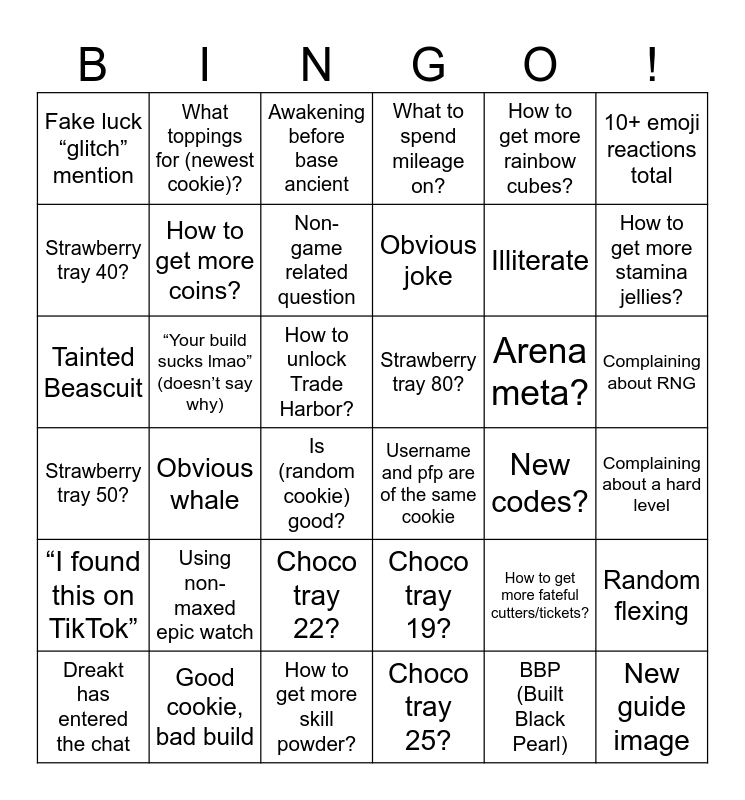 This bingo card has 36 words: Choco tray 19?, Choco tray 22?, Choco tray 25?, Strawberry tray 40?, Strawberry tray 50?, Strawberry tray 80?, How to get more coins?, How to get more skill powder?, How to get more rainbow cubes?, How to get more fateful cutters/tickets?, How to get more stamina jellies?, What to spend mileage on?, Random flexing, “Your build sucks lmao” (doesn’t say why), Obvious joke, Fake luck “glitch” mention, “I found this on TikTok”, Arena meta?, Tainted Beascuit, Awakening before base ancient, How to unlock Trade Harbor?, Obvious whale, Username and pfp are of the same cookie, Is (random cookie) good?, New codes?, What toppings for (newest cookie)?, Illiterate, Good cookie, bad build, Non-game related question, 10+ emoji reactions total, New guide image, Dreakt has entered the chat, Complaining about a hard level, Complaining about RNG, Using non-maxed epic watch and BBP (Built Black Pearl).