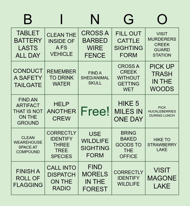 This bingo card has a free space and 24 words: CORRECTLY IDENTIFY THREE TREE SPECIES, CALL INTO DISPATCH ON THE RADIO, FIND A SHED/ANIMAL SKULL, FINISH A ROLL OF FLAGGING, VISIT MURDERERS CREEK GUARD STATION, TABLET BATTERY LASTS ALL DAY, CONDUCT A SAFETY TAILGATE, CLEAN THE INSIDE OF A FS VEHICLE, HIKE 5 MILES IN ONE DAY, USE WILDLIFE SIGHTING FORM, CROSS A CREEK WITHOUT GETTING WET, FIND AN ARTIFACT THAT IS NOT ON THE GROUND, BRING BAKED GOODS TO THE OFFICE, HIKE TO STRAWBERRY LAKE, REMEMBER TO DRINK WATER, CORRECTLY IDENTIFY WILDLIFE, PICK HUCKLEBERRIES DURING LUNCH, CROSS A BARBED WIRE FENCE, PICK UP TRASH IN THE WOODS, HELP ANOTHER CREW, VISIT MAGONE LAKE, CLEAN WEAREHOUSE SPACE AT COMPOUND, FILL OUT CATTLE SIGHTING FORM and FIND MORELS IN THE FOREST.