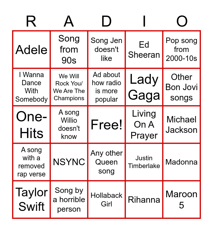 This bingo card has a free space and 39 words: Beautiful Things, Die With A Smile, Teddy Swims loses control, We Will Rock You/ We Are The Champions, Taylor Swift, Any other Queen song, Ad about how radio is more popular, Ad with a celebrity, Pop song from 2000-10s, A song with a removed rap verse, A song Willio doesn't know, Ed Sheeran, Maroon 5, Michael Jackson, Living On A Prayer, NSYNC, Right There All Along, Adele, Pink, Justin Timberlake, I Wanna Dance With Somebody, Hollaback Girl, Lady Gaga, Other Bon Jovi songs, Same artist 2+, Same song 2+, Double Entendre, Song plays in ad that won't play as an actual song, Song from 80s, Song from 90s, Food Ad, Bruno Mars, Song Jen doesn't like, Song by a horrible person, Rihanna, Miley Cyrus, Madonna, One-Hits and Double Shot Whiskey.