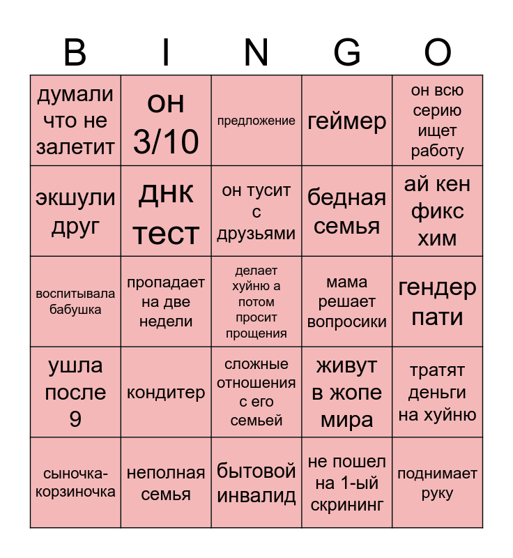 This bingo card has a free space and 24 words: кондитер, неполная семья, он тусит с друзьями, сыночка-корзиночка, он всю серию ищет работу, думали что не залетит, экшули друг, он 3/10, мама решает вопросики, сложные отношения с его семьей, бедная семья, воспитывала бабушка, живут в жопе мира, тратят деньги на хуйню, днк тест, не пошел на 1-ый скрининг, гендер пати, предложение, ай кен фикс хим, пропадает на две недели, поднимает руку, ушла после 9, геймер and бытовой инвалид.