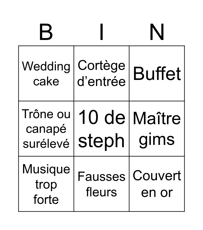 This bingo card has a free space and 8 words: Maître gims, Buffet, Cortège d’entrée, Musique trop forte, Wedding cake, Couvert en or, Trône ou canapé surélevé and Fausses fleurs.