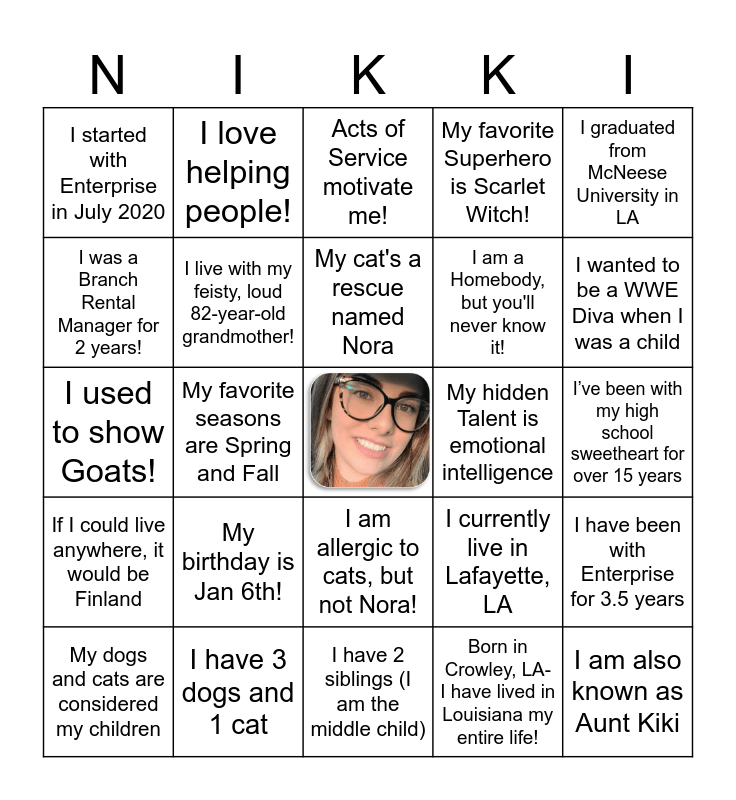 This bingo card has a free space and 24 words: My birthday is Jan 6th!, I have 3 dogs and 1 cat, My cat's a rescue named Nora, My dogs and cats are considered my children, I graduated from McNeese University in LA, I started with Enterprise in July 2020, I was a Branch Rental Manager for 2 years!, I love helping people!, My hidden Talent is emotional intelligence, I am allergic to cats, but not Nora!, I am a Homebody, but you'll never know it!, I used to show Goats!, I currently live in Lafayette, LA, I have been with Enterprise for 3.5 years, I live with my feisty, loud 82-year-old grandmother!, Born in Crowley, LA- I have lived in Louisiana my entire life!, I’ve been with my high school sweetheart for over 15 years, Acts of Service motivate me!, I wanted to be a WWE Diva when I was a child, My favorite seasons are Spring and Fall, I am also known as Aunt Kiki, If I could live anywhere, it would be Finland, My favorite Superhero is Scarlet Witch! and I have 2 siblings (I am the middle child).
