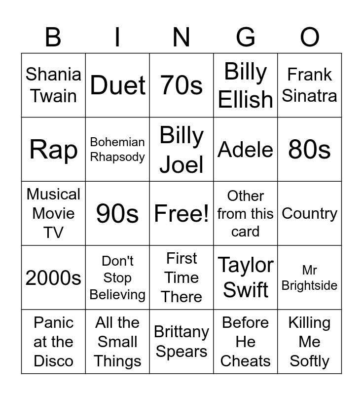 This bingo card has a free space and 24 words: Don't Stop Believing, All the Small Things, Billy Joel, Panic at the Disco, Frank Sinatra, Shania Twain, Rap, Duet, Other from this card, First Time There, Adele, Musical Movie TV, Taylor Swift, Mr Brightside, Bohemian Rhapsody, Before He Cheats, Country, 70s, 80s, 90s, Killing Me Softly, 2000s, Billy Ellish and Brittany Spears.