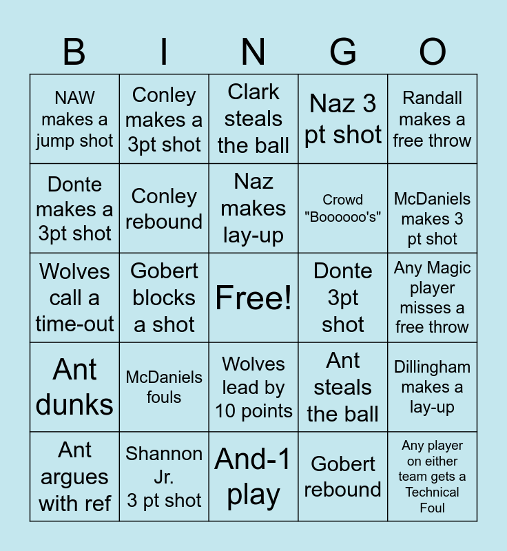 This bingo card has a free space and 24 words: Ant argues with ref, McDaniels fouls, Naz makes lay-up, Gobert rebound, Randall makes a free throw, NAW makes a jump shot, Conley makes a 3pt shot, Clark steals the ball, Donte 3pt shot, Any Magic player misses a free throw, Wolves call a time-out, Conley rebound, Ant steals the ball, Dillingham makes a lay-up, Donte makes a 3pt shot, Shannon Jr. 3 pt shot, And-1 play, Naz 3 pt shot, McDaniels makes 3 pt shot, Ant dunks, Gobert blocks a shot, Wolves lead by 10 points, Crowd "Boooooo's" and Any player on either team gets a Technical Foul.