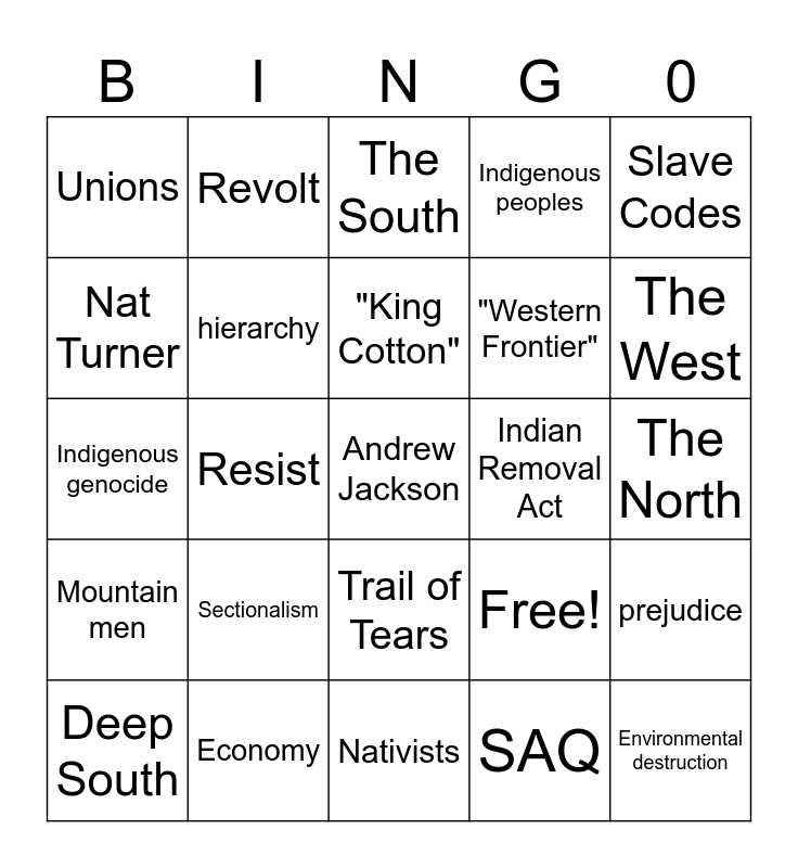This bingo card has 25 words: Sectionalism, Nativists, "King Cotton", Deep South, Slave Codes, Unions, Nat Turner, Revolt, Indian Removal Act, Trail of Tears, "Western Frontier", Indigenous genocide, Free!, prejudice, hierarchy, Environmental destruction, The North, The South, The West, Resist, Andrew Jackson, Economy, Mountain men, Indigenous peoples and SAQ.