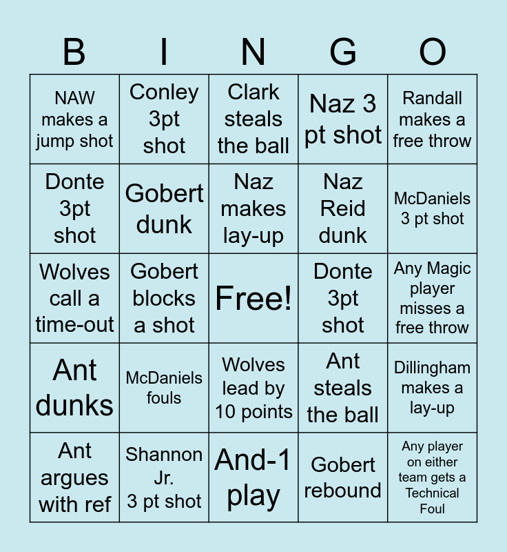 This bingo card has a free space and 24 words: Ant argues with ref, McDaniels fouls, Naz makes lay-up, Gobert rebound, Randall makes a free throw, NAW makes a jump shot, Conley 3pt shot, Clark steals the ball, Donte 3pt shot, Any Magic player misses a free throw, Wolves call a time-out, Gobert dunk, Ant steals the ball, Dillingham makes a lay-up, Donte 3pt shot, Shannon Jr. 3 pt shot, And-1 play, Naz 3 pt shot, McDaniels 3 pt shot, Ant dunks, Gobert blocks a shot, Wolves lead by 10 points, Naz Reid dunk and Any player on either team gets a Technical Foul.