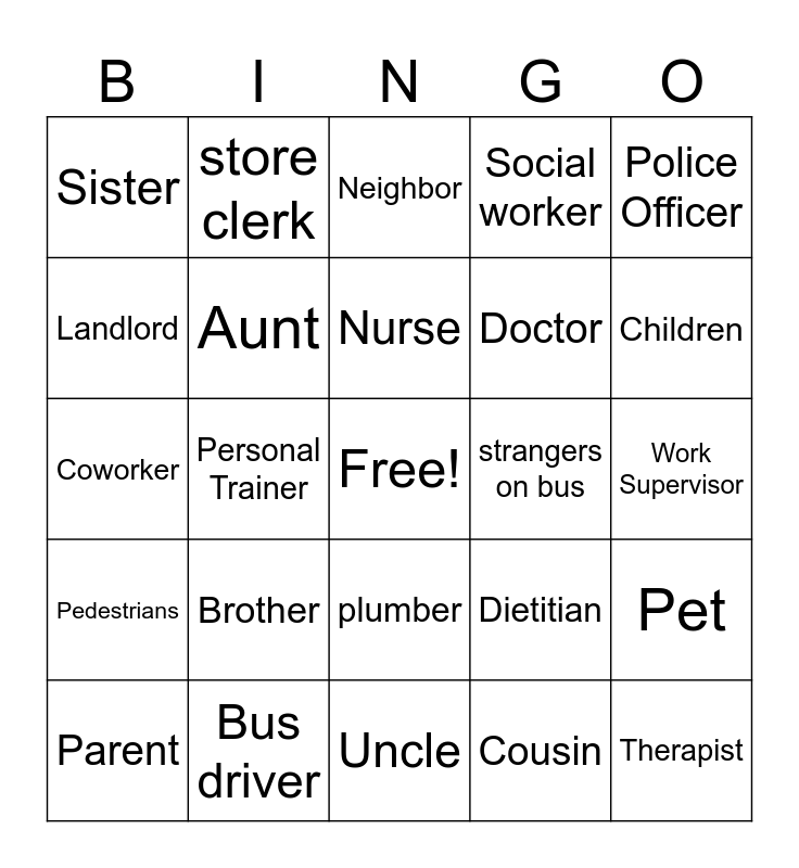 This bingo card has a free space and 24 words: Brother, Bus driver, Nurse, Parent, Police Officer, Sister, Landlord, store clerk, strangers on bus, plumber, Doctor, Coworker, Dietitian, Pet, Aunt, Cousin, Work Supervisor, Neighbor, Children, Personal Trainer, Therapist, Pedestrians, Social worker and Uncle.