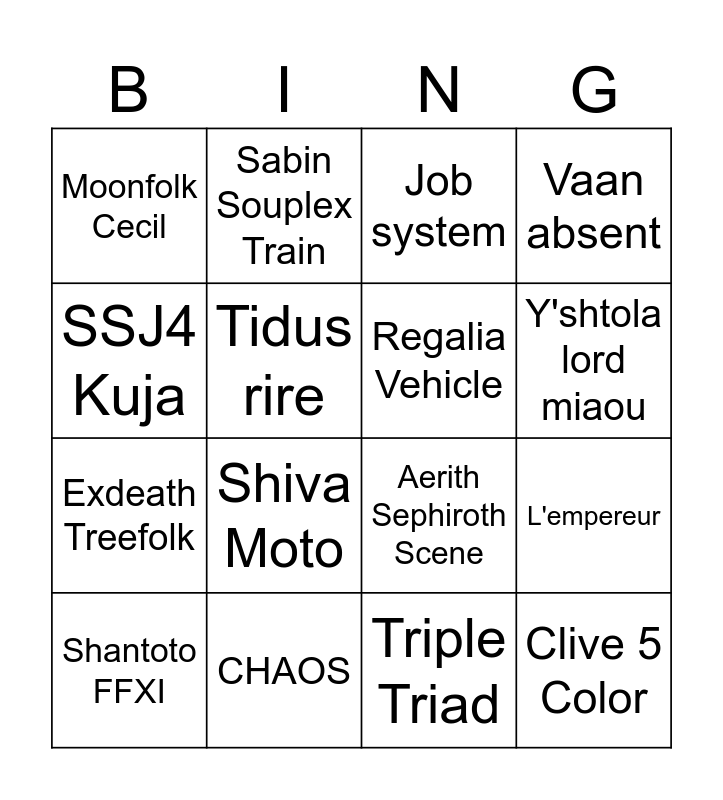 This bingo card has 16 words: CHAOS, L'empereur, Job system, Moonfolk Cecil, Exdeath Treefolk, Sabin Souplex Train, Aerith Sephiroth Scene, Triple Triad, SSJ4 Kuja, Tidus rire, Shantoto FFXI, Vaan absent, Shiva Moto, Y'shtola lord miaou, Regalia Vehicle and Clive 5 Color.