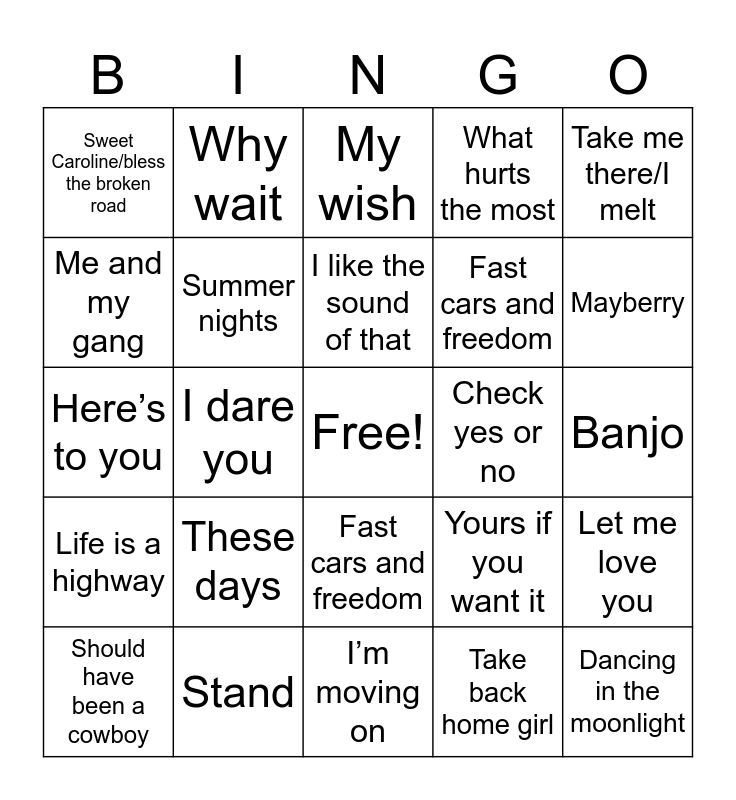 This bingo card has a free space and 24 words: These days, Stand, I like the sound of that, Should have been a cowboy, Take me there/I melt, Sweet Caroline/bless the broken road, Me and my gang, Why wait, Check yes or no, Fast cars and freedom, Fast cars and freedom, Here’s to you, Yours if you want it, Let me love you, Summer nights, Take back home girl, Banjo, My wish, Mayberry, I dare you, Dancing in the moonlight, Life is a highway, What hurts the most and I’m moving on.