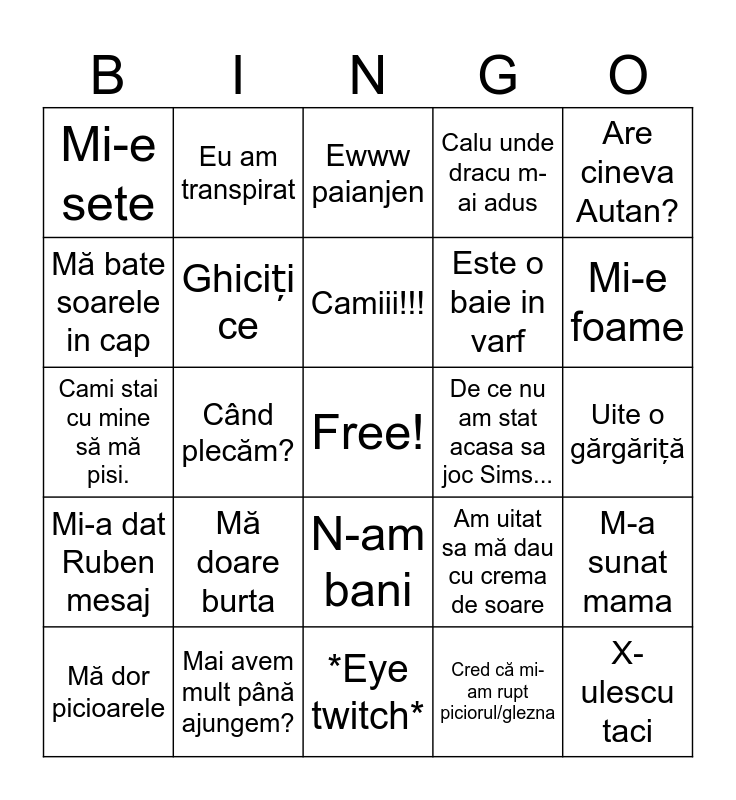 This bingo card has a free space and 24 words: Mă doare burta, Mai avem mult până ajungem?, Camiii!!!, Mă dor picioarele, Are cineva Autan?, Mi-e sete, Mă bate soarele in cap, Eu am transpirat, De ce nu am stat acasa sa joc Sims..., N-am bani, Este o baie in varf, Cami stai cu mine să mă pisi., Am uitat sa mă dau cu crema de soare, M-a sunat mama, Ghiciți ce, Cred că mi-am rupt piciorul/glezna, Uite o gărgăriță, Ewww paianjen, Mi-e foame, Când plecăm?, X-ulescu taci, Mi-a dat Ruben mesaj, Calu unde dracu m-ai adus and *Eye twitch*.