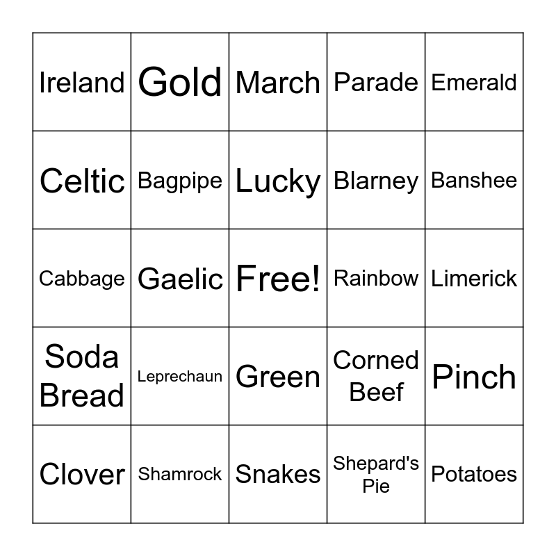 This bingo card has a free space and 24 words: Leprechaun, Shamrock, Lucky, Clover, Emerald, Ireland, Celtic, Gold, Rainbow, Green, Blarney, Cabbage, Corned Beef, Pinch, Bagpipe, Shepard's Pie, Limerick, March, Banshee, Gaelic, Potatoes, Soda Bread, Parade and Snakes.
