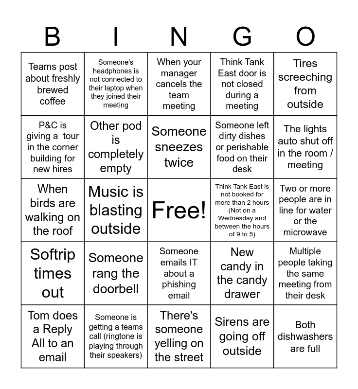 This bingo card has a free space and 49 words: Finance made a comment on attendance, Both dishwashers are full, Funky smell coming from the kitchen, There's someone yelling on the street, Someone rang the doorbell, Someone remote in IT is in Berkeley Office, Someone's headphones is not connected to their laptop when they joined their meeting, When something in the corner building needs maintenance (water filter, coffee machine, etc), P&C is giving a tour in the corner building for new hires, Our pod is complete, Other pod is completely empty, Think Tank East door is not closed during a meeting, Multiple people taking the same meeting from their desk, New candy in the candy drawer, Lost or Found item posted in Teams, Finance has a potluck and doesn't invite IT, Someone sneezes twice, Think Tank East is not booked for more than 2 hours (Not on a Wednesday and between the hours of 9 to 5), You have the meeting room booked, but someone else takes over it, Tires screeching from outside, Music is blasting outside, Sirens are going off outside, Teams post about freshly brewed coffee, Someone left dirty dishes or perishable food on their desk, Someone slammed the toilet seat, The lights auto shut off in the room / meeting, Tom does a Reply All to an email, Someone emails the entire IT dept instead of helpdesk, Someone emails IT about a phishing email, Softrip times out, A complimentary trip (or hotel) email goes out, "Circle back" is used in a meeting, "Close the loop" is used in a meeting, Server maintenance email goes out, Someone is getting a teams call (ringtone is playing through their speakers), Someone (not playing bingo made a comment on the building temperature), Music starts playing from someone's laptop or phone, Other pod and our pod are all in office, Two or more people are in line for water or the microwave, When there's a new face and someone asks, "Who is that?" / "Who are they?", Someone messages on Teams while they're on vacation, Someone (not yourself) left their computer on, When there is a post about correcting bad behavior, When your computer decides to restart all of a sudden, When birds are walking on the roof, When your manager cancels the team meeting, When your manager cancels your 1:1, When someone uses "Correct me if I'm wrong" in a meeting (or some variant) and Someone from IT makes a business trip (Not Berkeley).
