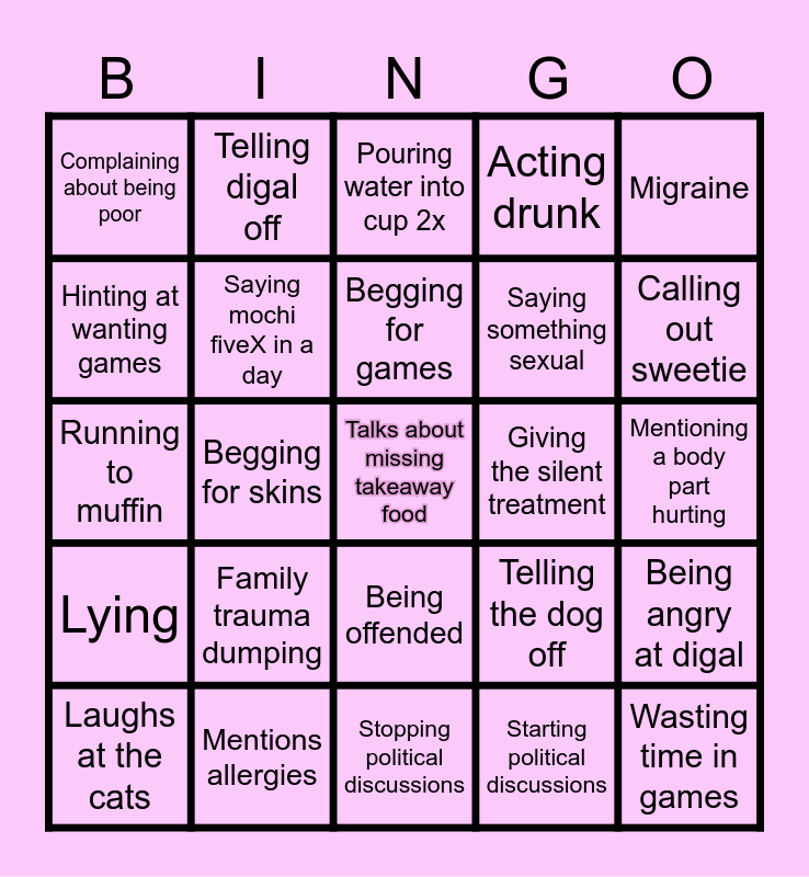 This bingo card has a free space and 24 words: Family trauma dumping, Mentions allergies, Begging for games, Laughs at the cats, Migraine, Complaining about being poor, Hinting at wanting games, Telling digal off, Giving the silent treatment, Being offended, Saying something sexual, Running to muffin, Telling the dog off, Being angry at digal, Saying mochi fiveX in a day, Starting political discussions, Mentioning a body part hurting, Pouring water into cup 2x, Calling out sweetie, Begging for skins, Wasting time in games, Lying, Acting drunk and Stopping political discussions.