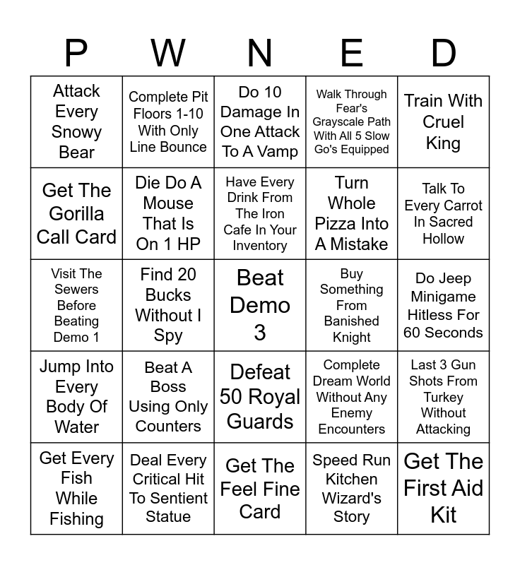 This bingo card has a free space and 24 words: Beat A Boss Using Only Counters, Deal Every Critical Hit To Sentient Statue, Have Every Drink From The Iron Cafe In Your Inventory, Get Every Fish While Fishing, Train With Cruel King, Attack Every Snowy Bear, Get The Gorilla Call Card, Complete Pit Floors 1-10 With Only Line Bounce, Buy Something From Banished Knight, Defeat 50 Royal Guards, Turn Whole Pizza Into A Mistake, Visit The Sewers Before Beating Demo 1, Complete Dream World Without Any Enemy Encounters, Last 3 Gun Shots From Turkey Without Attacking, Die Do A Mouse That Is On 1 HP, Speed Run Kitchen Wizard's Story, Do Jeep Minigame Hitless For 60 Seconds, Do 10 Damage In One Attack To A Vamp, Talk To Every Carrot In Sacred Hollow, Find 20 Bucks Without I Spy, Get The First Aid Kit, Jump Into Every Body Of Water, Walk Through Fear's Grayscale Path With All 5 Slow Go's Equipped and Get The Feel Fine Card.