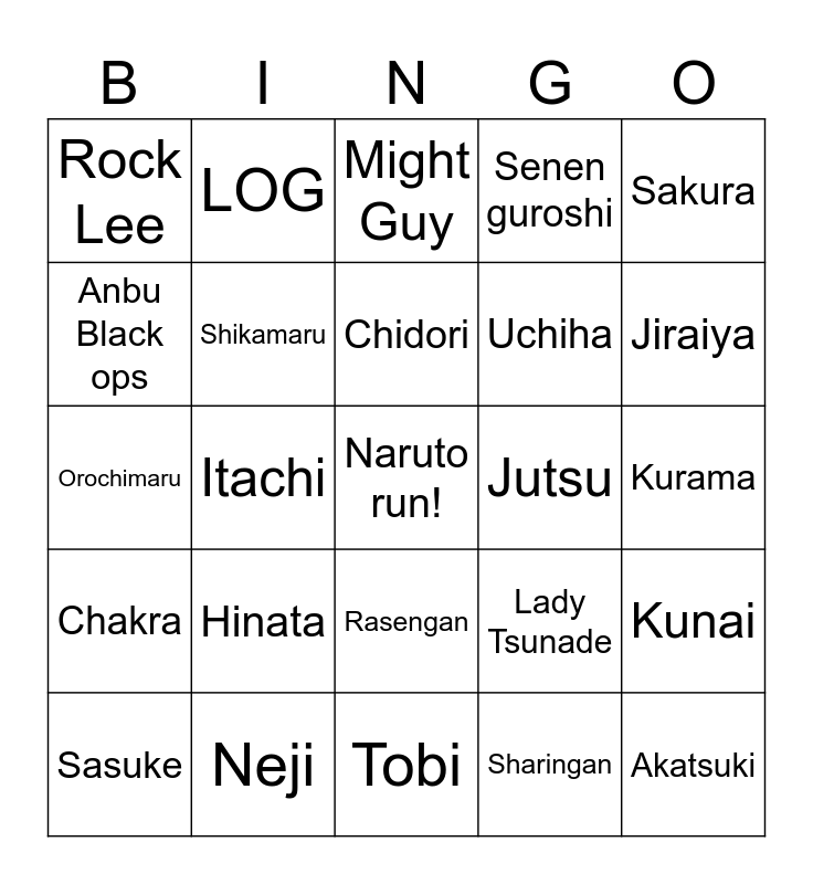 This bingo card has a free space and 29 words: Sasuke, Naruto, Itachi, Kakashi, Rock Lee, Might Guy, Shikamaru, Hinata, Jutsu, Neji, Kurama, Akatsuki, Tobi, Sharingan, Jiraiya, Hokage, Rasengan, Chakra, Sakura, Orochimaru, Lady Tsunade, Gaara, Uchiha, Anbu Black ops, Senen guroshi, LOG, Kunai, Chidori and Hand signs.