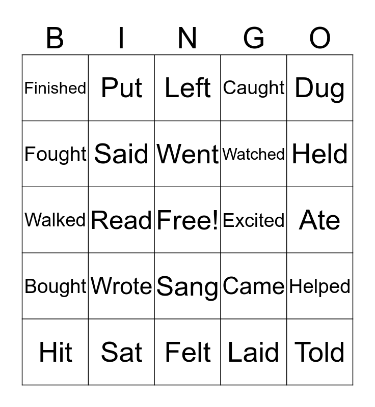 This bingo card has a free space and 24 words: Wrote, Sat, Went, Hit, Dug, Finished, Fought, Put, Excited, Sang, Watched, Walked, Came, Helped, Said, Laid, Ate, Left, Held, Read, Told, Bought, Caught and Felt.