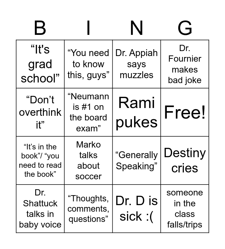 This bingo card has 17 words: Dr. D is sick :(, Dr. Shattuck talks in baby voice, Dr. Appiah says muzzles, “It's grad school”, Marko talks about soccer, Dr. Fournier makes bad joke, Destiny cries, Rami pukes, Free!, “Neumann is #1 on the board exam”, “Thoughts, comments, questions”, “Generally Speaking”, “Don’t overthink it”, “You need to know this, guys”, “It’s in the book”/ “you need to read the book”, "this is how it is" and someone in the class falls/trips.