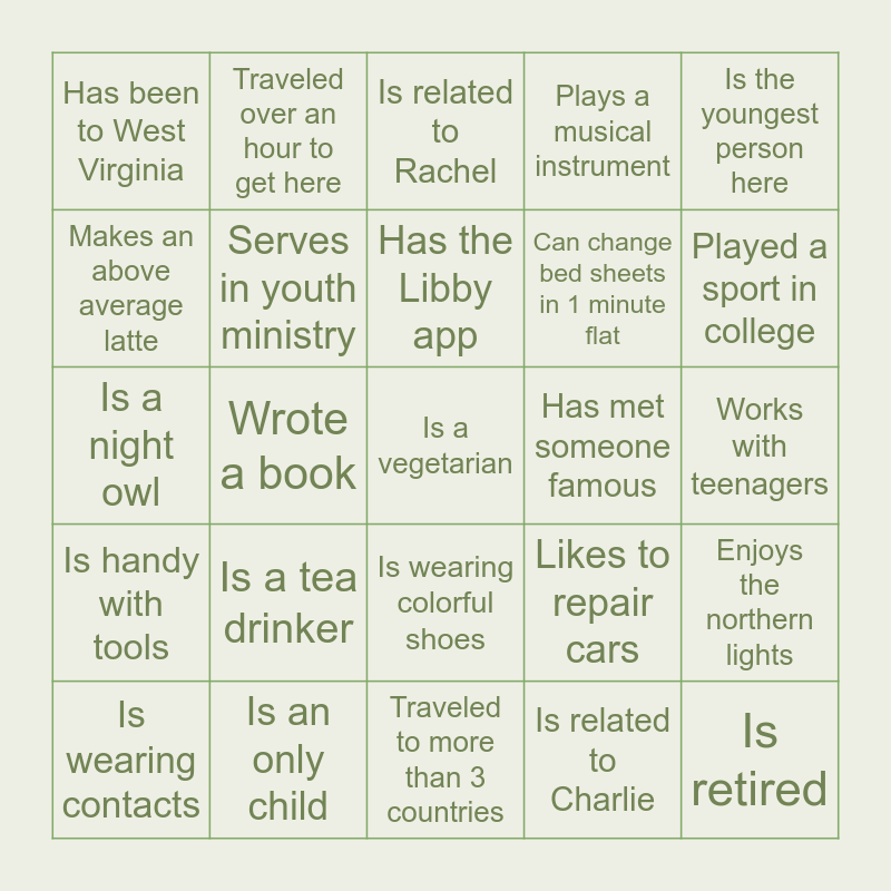 This bingo card has 44 words: Free!, Is a vegetarian, Is wearing glasses, Is wearing contacts, Is multilingual, Is related to Charlie, Is related to Rachel, Has 3 or more children, Is the youngest person here, Is an only child, Plays a musical instrument, Has met someone famous, Is wearing colorful shoes, Is a tea drinker, Has a tattoo, Traveled to more than 3 countries, Is wearing a watch, Is a night owl, Is a morning person, Played a sport in college, Traveled over an hour to get here, Doesn’t drink coffee, Has been to TN, Has been to West Virginia, Has been to the Czech Republic, Works with teenagers, Recently went to Idaho, Plays the accordion, Likes to repair cars, Is handy with tools, Has been on multiple hiking trails, Enjoys the northern lights, Loves to paint clouds, Enjoys signing, Wrote a book, Has prepared curriculum, Is an avid soccer fan, Is retired, Has the Libby app, Makes an above average latte, Can change bed sheets in 1 minute flat, Is a whiz at scheduling appointments, Serves in youth ministry and Loves to read.