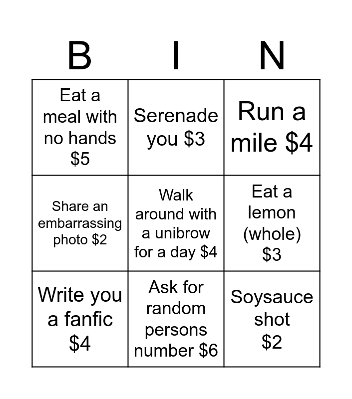 This bingo card has a free space and 8 words: Eat a lemon (whole) $3, Run a mile $4, Serenade you $3, Write you a fanfic $4, Eat a meal with no hands $5, Soysauce shot $2, Share an embarrassing photo $2 and Ask for random persons number $6.