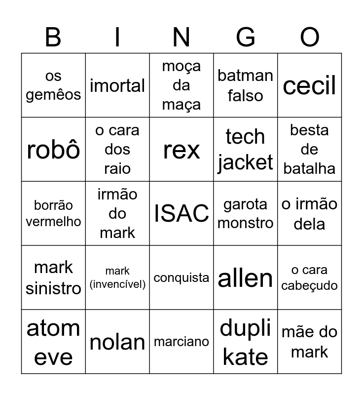 This bingo card has a free space and 24 words: mark (invencível), nolan, rex, atom eve, cecil, os gemêos, robô, imortal, garota monstro, conquista, tech jacket, borrão vermelho, allen, o cara cabeçudo, o cara dos raio, dupli kate, o irmão dela, moça da maça, besta de batalha, irmão do mark, mãe do mark, mark sinistro, batman falso and marciano.