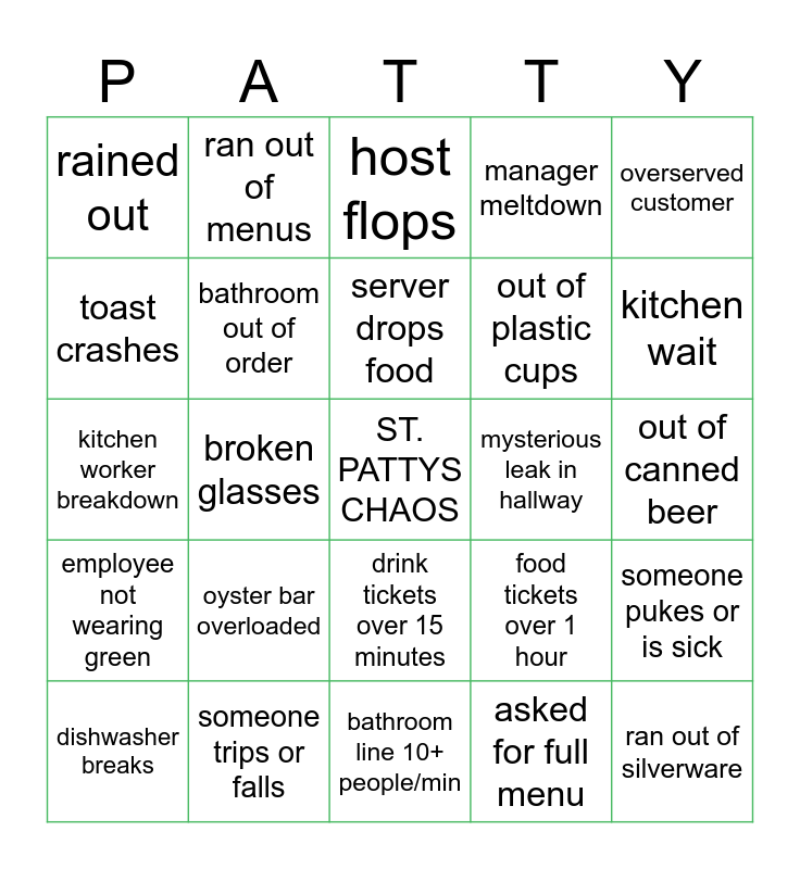 This bingo card has a free space and 24 words: oyster bar overloaded, someone trips or falls, server drops food, dishwasher breaks, overserved customer, rained out, toast crashes, ran out of menus, mysterious leak in hallway, drink tickets over 15 minutes, out of plastic cups, kitchen worker breakdown, food tickets over 1 hour, someone pukes or is sick, bathroom out of order, asked for full menu, out of canned beer, host flops, kitchen wait, broken glasses, ran out of silverware, employee not wearing green, manager meltdown and bathroom line 10+ people/min.