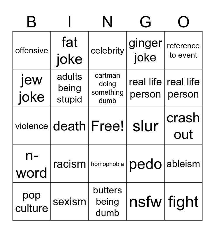 This bingo card has a free space and 24 words: racism, sexism, cartman doing something dumb, pop culture, reference to event, offensive, jew joke, fat joke, slur, homophobia, real life person, violence, pedo, ableism, adults being stupid, nsfw, crash out, celebrity, real life person, death, fight, n-word, ginger joke and butters being dumb.