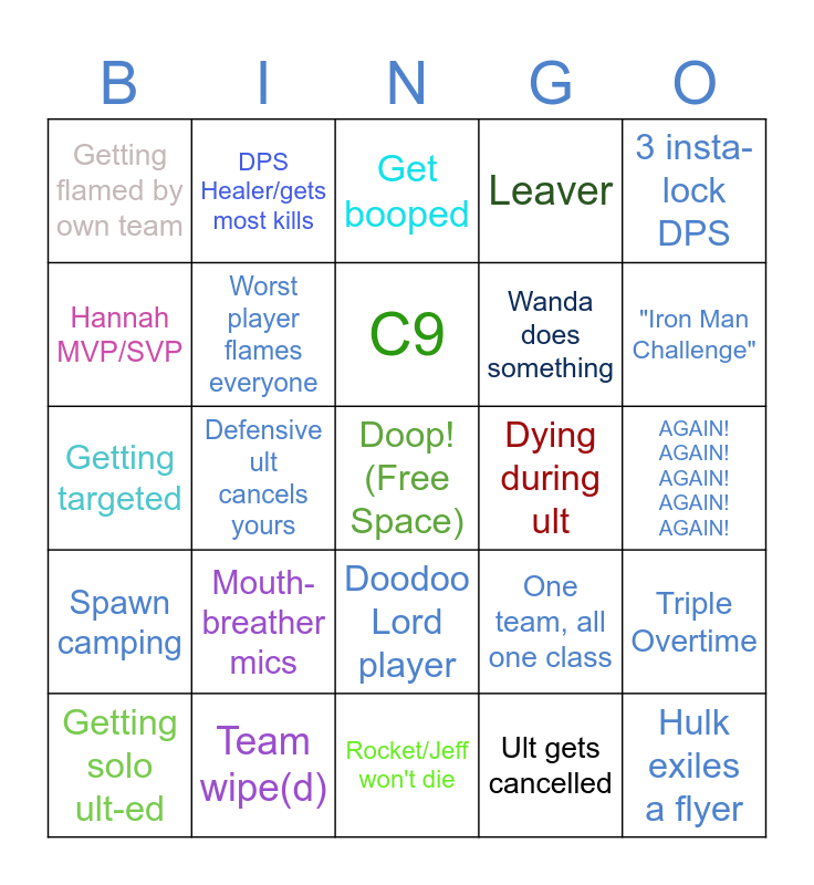 This bingo card has a free space and 45 words: Who's fearing Magneto?, Hulk exiles a flyer, "Heal diff/no heals", Getting solo ult-ed, Cancel an ult, Ult gets cancelled, Get booped, Evil Jaden Portal, 3 insta-lock DPS, Team wipe(d), Leaver, Dying during ult, Doodoo Lord player, Mouth-breather mics, Dive DPS eats dirt, Rocket/Jeff won't die, DPS ult does nothing, Getting targeted, Character select hover, "Iron Man Challenge", DPS Healer/gets most kills, WTF was that turret??, Getting flamed by enemy, Getting flamed by own team, Girl Power (5+), AGAIN! AGAIN! AGAIN! AGAIN! AGAIN!, Double Negative, Doesn't Swap, Freaky, One team, all one class, Spawn camping, Instant death upon match start, Triple Overtime, 0 kill round, Get kidnapped, Lord flex (on us), Defensive ult cancels yours, Get revived and immediately die again, >10% accuracy, Horrible highlight, C9, Hannah MVP/SVP, Wanda does something, No tanks, Worst player flames everyone and TTV or YT (or stream link).