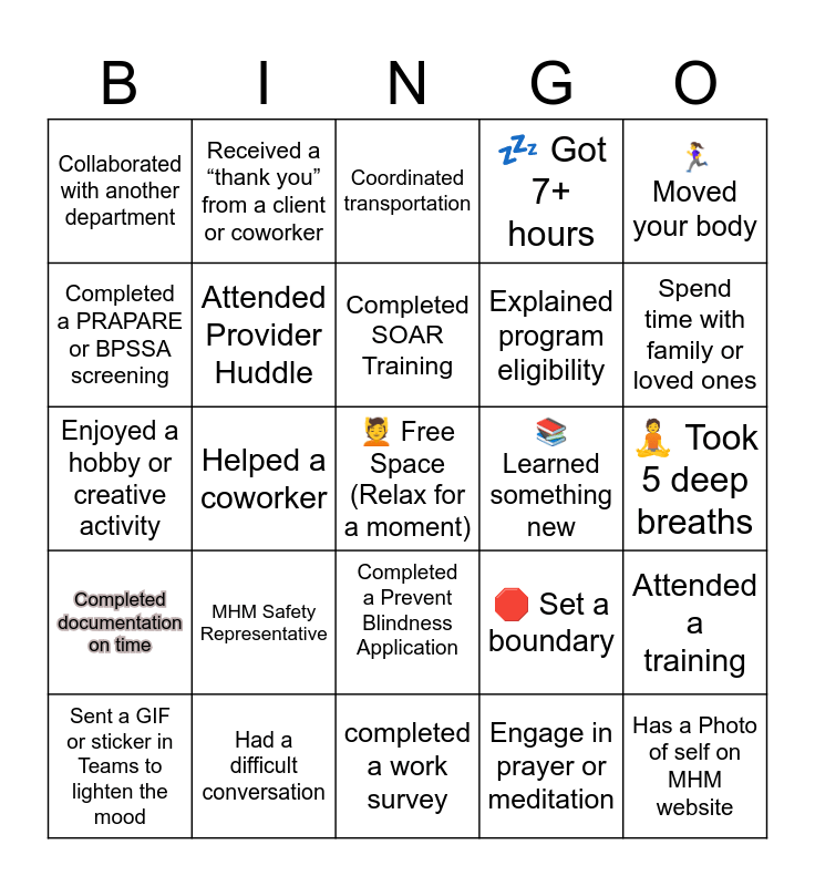 This bingo card has a free space and 69 words: Used motivational interviewing, π§ Took 5 deep breaths, β Enjoyed a cup of coffee/tea, π° Left work on time, Had a difficult conversation, Enjoyed a quiet moment, π€ Got 7+ hours, Assisted with food assistance, πββοΈ Moved your body, Provided crisis intervention, Attended a training, Referred a client to a resource, Collaborated with another department, Coordinated transportation, π Said something kind to yourself, Helped a coworker, Completed a Prevent Blindness Application, Explained program eligibility, Read a book, Completed documentation on time, π Learned something new, π Set a boundary, Spend time with family or loved ones, πΆ Listened to a favorite song, I'm a LMSW, I'M a LCSW, I'm a LBSW, Enrolled Client in Bridge of Blessing, Engage in prayer or meditation, Attended a staff meeting, Received a βthank youβ from a client or coworker, Submitted a Support Ticket, Provided a community resource to a client, Learned something new about a resource, Gave a shout-out to a coworker, Celebrated a small client success, Used humor to lighten the mood, Worked On Goals, Completed a PRAPARE or BPSSA screening, MHM Ambassador, MHM Safety Representative, Has a Photo of self on MHM website, Reviewed CPS Portal for an EAF, Sought guidance from my supervisor, Have Less than 5 unread emails, Sent a GIF or sticker in Teams to lighten the mood, Attended an R&E Exercise Class, March birthday! ππ, forgot your password to SFAX this month, Attended Provider Huddle, Completed SOAR Training, Used IPAD Interpreter, Eat Lunch with Coworker, completed a work survey, NASW Member, Listened to a Podcast or Audio Book, DANCED, Took a real lunch break (not at your desk), Asked for help when needed, Enjoyed a hobby or creative activity, Took a stretch break between meetings, Set a realistic to-do list (and didnβt overcommit), Created a calm workspace (decluttered desk, plants, etc.), Spent time with a pet, Did a progressive muscle relaxation exercise, Wrote down three things youβre grateful for, Laughedβbecause humor helps anxiety!, Sat in the sun for a few minutes (Vitamin D boost!) and Listened to birds, wind, or nature sounds.