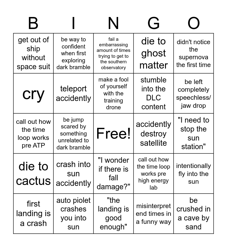 This bingo card has a free space and 24 words: crash into sun accidently, auto piolet crashes you into sun, make a fool of yourself with the training drone, first landing is a crash, didn't notice the supernova the first time, get out of ship without space suit, cry, be way to confident when first exploring dark bramble, accidently destroy satellite, "I wonder if there is fall damage?", stumble into the DLC content, call out how the time loop works pre ATP, call out how the time loop works pre high energy lab, intentionally fly into the sun, teleport accidently, misinterpret end times in a funny way, "I need to stop the sun station", fail a embarrassing amount of times trying to get to the southern observatory, be left completely speechless/ jaw drop, be jump scared by something unrelated to dark bramble, be crushed in a cave by sand, die to cactus, die to ghost matter and "the landing is good enough".