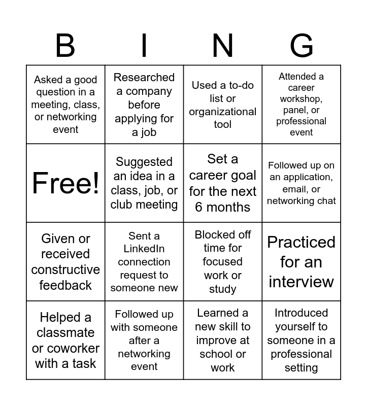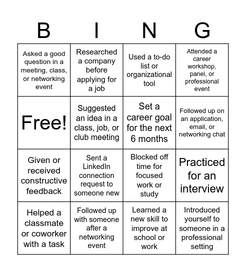 This bingo card has 16 words: Followed up with someone after a networking event, Practiced for an interview, Used a to-do list or organizational tool, Asked a good question in a meeting, class, or networking event, Given or received constructive feedback, Researched a company before applying for a job, Blocked off time for focused work or study, Learned a new skill to improve at school or work, Free!, Suggested an idea in a class, job, or club meeting, Helped a classmate or coworker with a task, Attended a career workshop, panel, or professional event, Sent a LinkedIn connection request to someone new, Followed up on an application, email, or networking chat, Set a career goal for the next 6 months and Introduced yourself to someone in a professional setting.