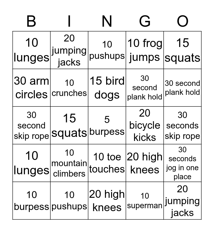 This bingo card has a free space and 24 words: 10 mountain climbers, 10 pushups, 15 bird dogs, 10 burpess, 15 squats, 10 lunges, 30 arm circles, 20 jumping jacks, 20 bicycle kicks, 10 toe touches, 30 second plank hold, 30 second skip rope, 20 high knees, 30 seconds jog in one place, 10 crunches, 10 superman, 30 seconds skip rope, 10 pushups, 30 second plank hold, 15 squats, 20 jumping jacks, 10 lunges, 10 frog jumps and 20 high knees.