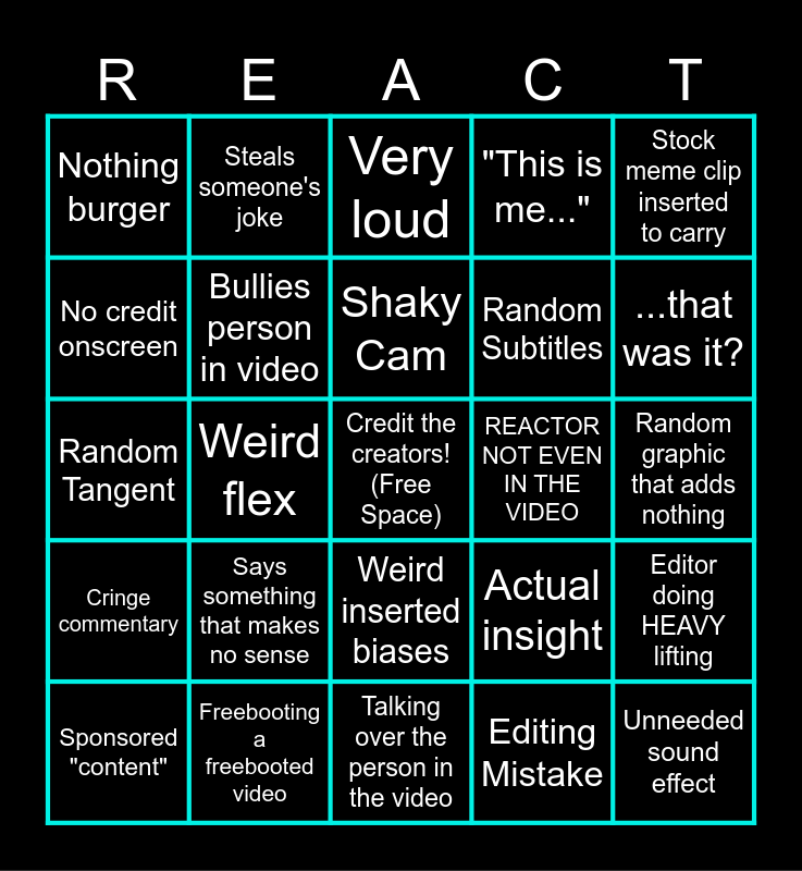 This bingo card has a free space and 31 words: Forgets to React, Freebooting a freebooted video, Shaky Cam, Summarizing the video, Stock meme clip inserted to carry, Nothing burger, Weird flex, Talking over the person in the video, Random Subtitles, Unneeded sound effect, Sponsored "content", Says something that makes no sense, Editing Mistake, Only reacts with a laugh, Cringe commentary, TikTok doesn't match the title, Weird inserted biases, REACTOR NOT EVEN IN THE VIDEO, Random graphic that adds nothing, Badly Cropped, Steals someone's joke, Over-dramatizing the TikTok, Actual insight, ...that was it?, Random Tangent, Bullies person in video, Very loud, "This is me...", Editor doing HEAVY lifting, No credit onscreen and Replays the video.