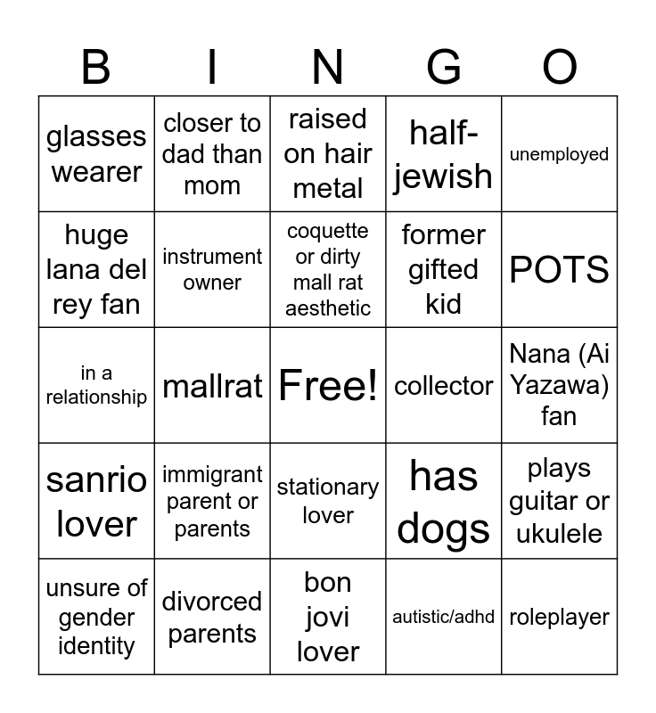 This bingo card has a free space and 24 words: immigrant parent or parents, divorced parents, coquette or dirty mall rat aesthetic, unsure of gender identity, unemployed, glasses wearer, huge lana del rey fan, closer to dad than mom, collector, stationary lover, former gifted kid, in a relationship, has dogs, plays guitar or ukulele, instrument owner, autistic/adhd, Nana (Ai Yazawa) fan, raised on hair metal, POTS, mallrat, roleplayer, sanrio lover, half-jewish and bon jovi lover.