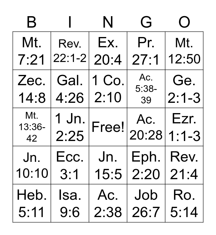 This bingo card has a free space and 24 words: Ecc. 3:1, Isa. 9:6, 1 Co. 2:10, Heb. 5:11, Mt. 12:50, Mt. 7:21, Zec. 14:8, Rev. 22:1-2, Ac. 20:28, Jn. 15:5, Ac. 5:38-39, Mt. 13:36-42, Eph. 2:20, Rev. 21:4, Gal. 4:26, Job 26:7, Ezr. 1:1-3, Ex. 20:4, Ge. 2:1-3, 1 Jn. 2:25, Ro. 5:14, Jn. 10:10, Pr. 27:1 and Ac. 2:38.